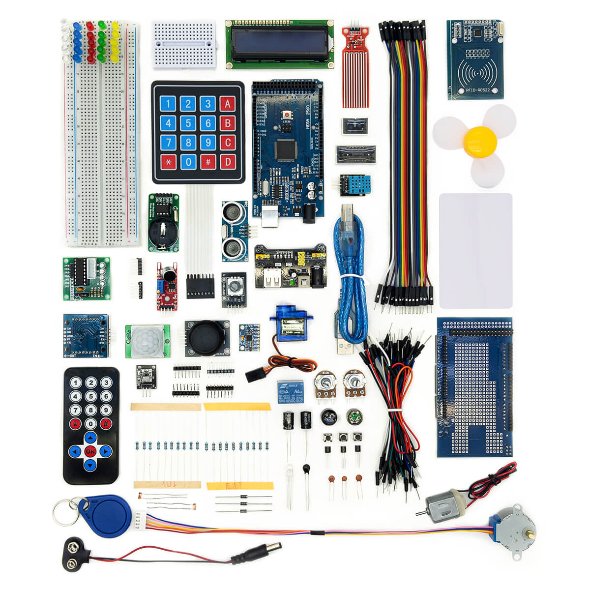 Ардуино Mega Kit включает в себя одноименную плату с процессором и комплект перемычек, датчиков, резисторов, переключателей, светодиодов. Позволяет создавать электронные схемы без пайки. Подойдет для новичков, для работы с набором не нужны знания в области программирования. Плата подключается к компьютеру через USB интерфейс, специальный программатор не требуется.